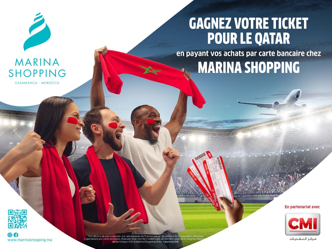 Pour cela, payez par carte bancaire vos achats au centre commercial Marina Shopping et cumulez 3 achats de plus de 300 DH pour être éligible à cette grande tombola et tenter de gagner votre billet pour le Qatar !
