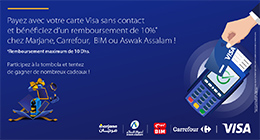 Ainsi, du 05/04/2021 au 02/05/2021, pour les premiers paiements sans contact dans les enseignes Marjane, Carrefour, BIM ou Aswak Assalam, les détenteurs de carte Visa bénéficieront d'un remboursement de 10%.