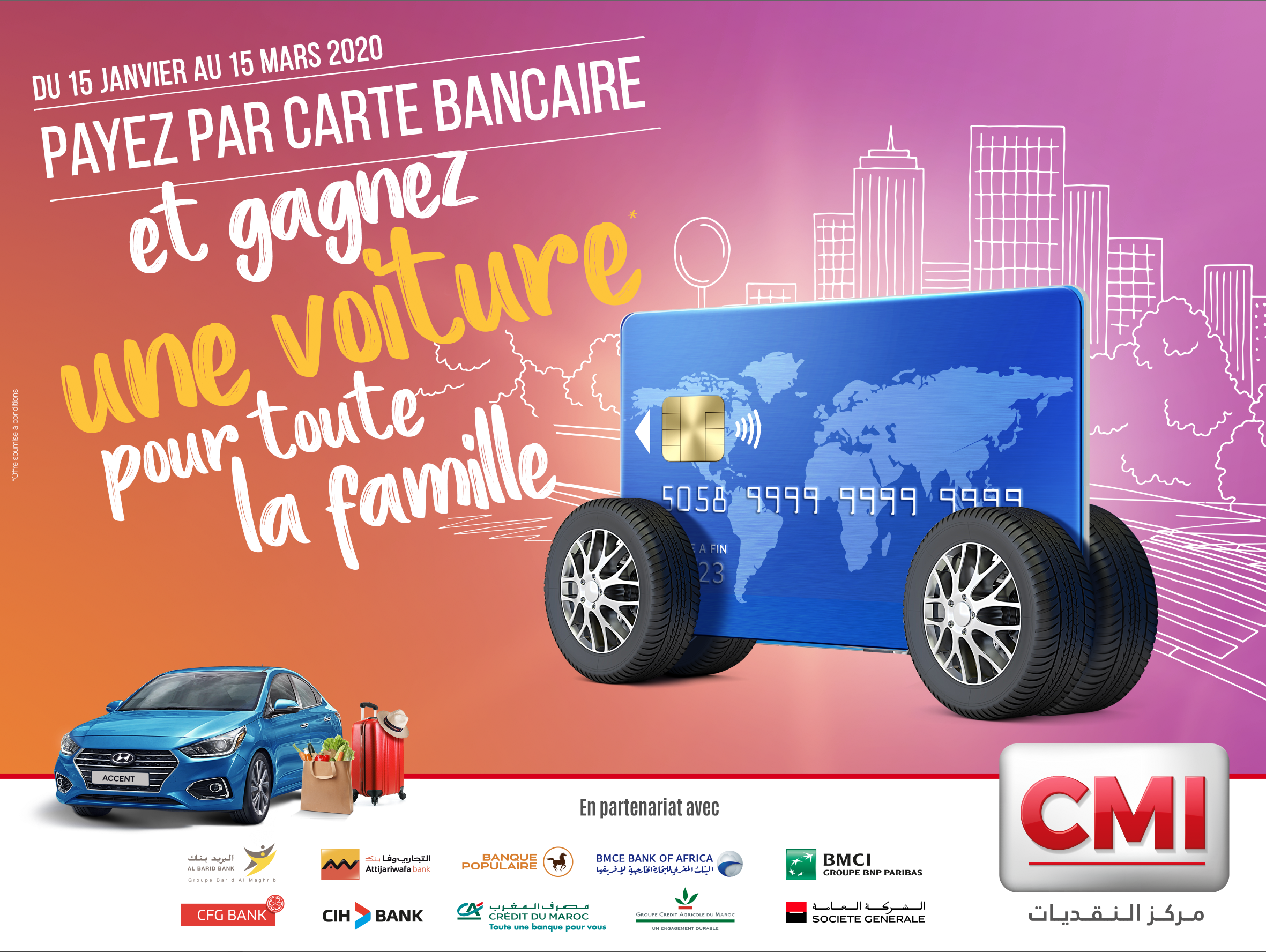Fidèle à son engagement pour le développement des paiements électroniques au Maroc, le CMI lance, en partenariat avec AL BARID BANK, ATTIJARIWAFA BANK, BANQUE POPULAIRE, BMCE BANK, BMCI, CFG BANK, CIH BANK, CREDIT DU MAROC, CREDIT AGRICOLE DU MAROC, et SOCIÉTÉ GÉNÉRALE, une opération nationale de promotion du paiement par carte bancaire.