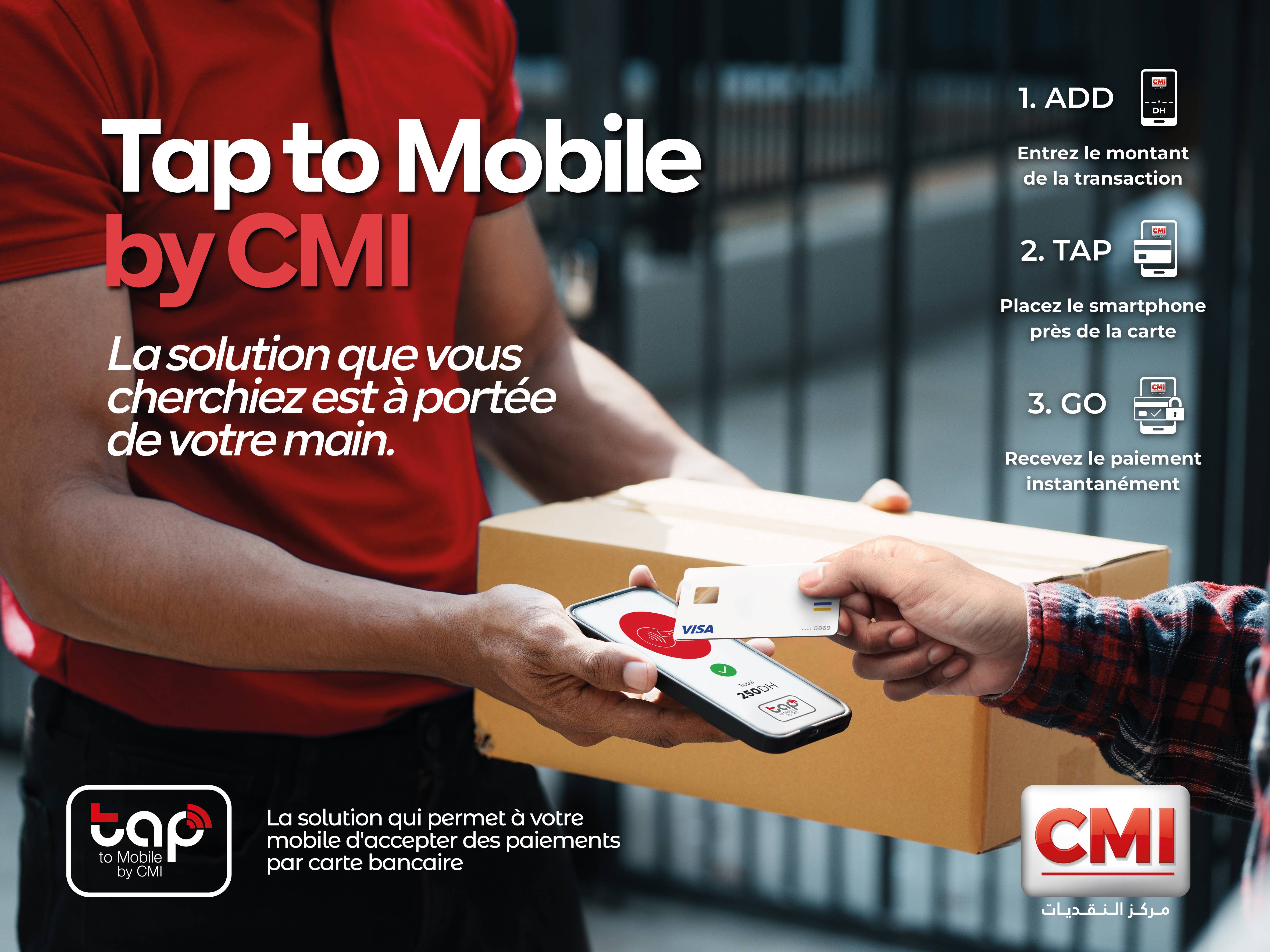 Grâce à “Tap to mobile”, les porteurs de cartes bancaires ou de wallets, locaux ou internationaux, peuvent effectuer leurs paiements en approchant simplement leur carte ou leur dispositif mobile (téléphone, smartwatch, ...) des smartphones ou tablettes des commerçants dotés de l’application de paiement sécurisée Soft POS fournie par le CMI et profiter d'une expérience de paiement simple, rapide et sécurisée.