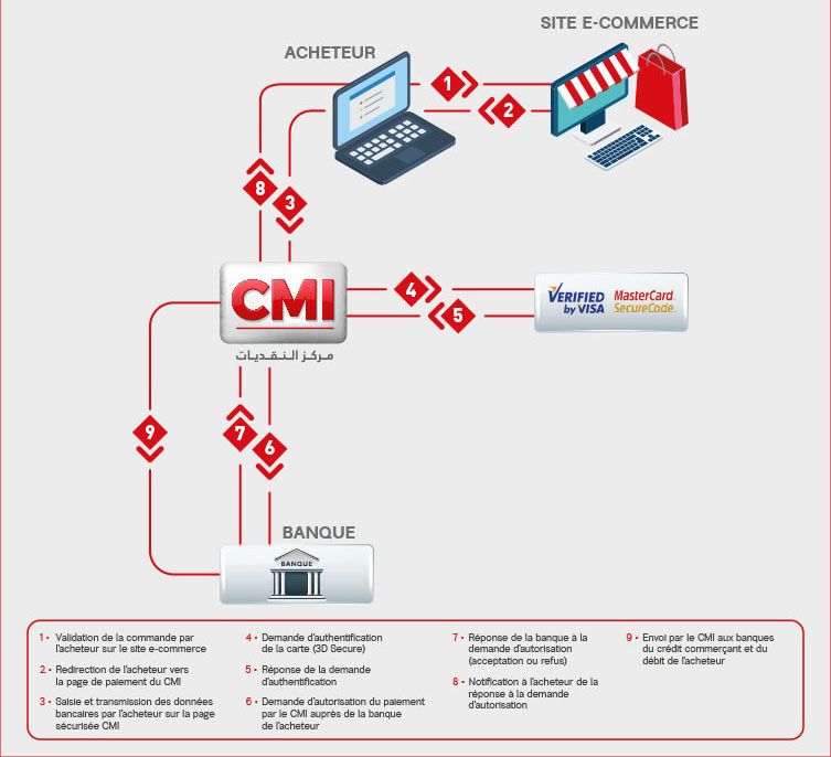 Si la carte est munie de l’authentification 3D Secure, l’acheteur est amené à saisir un code secret avant de pouvoir procéder à la demande de l’autorisation de paiement. Ce service, actif via la plateforme du CMI, permet à tous les porteurs de cartes locales Visa, MasterCard ou Carte CMI, de réaliser leurs paiements en ligne dans des conditions optimales de simplicité, de sécurité et de rapidité.